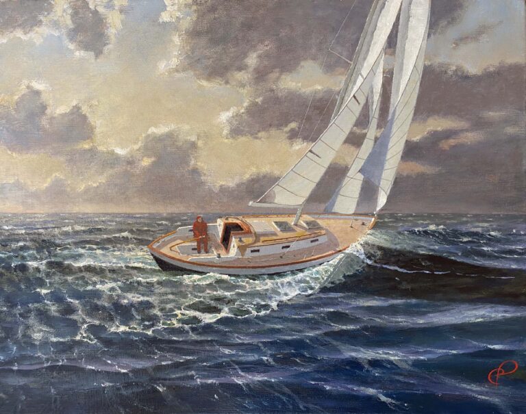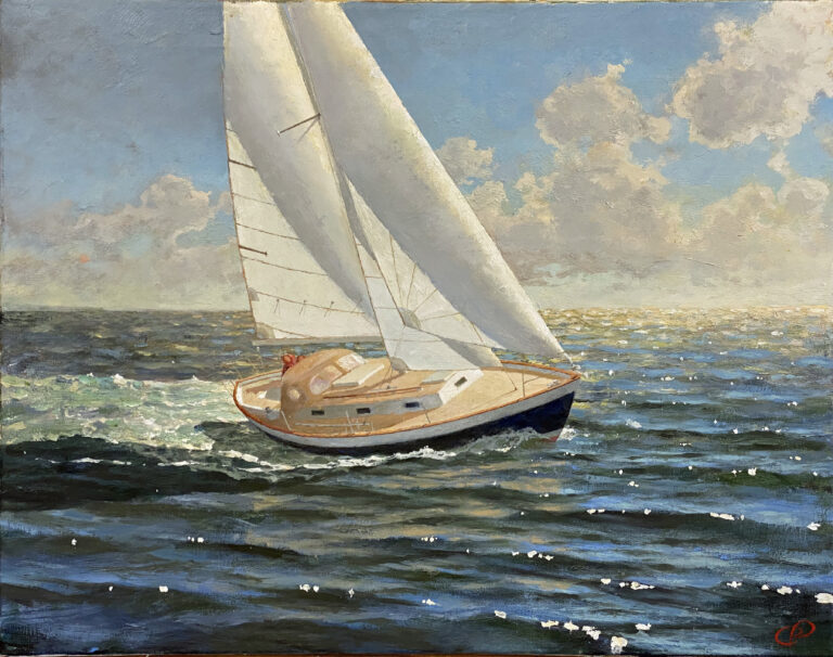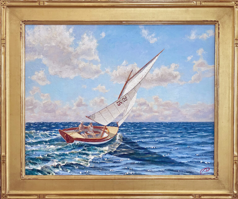 HERRESHOFF 12 1 Oil on Canvas. 24 x 36″ $4500 BECAUSE IT LOOKS so good in this frame, I am willing to sell this painting, framed, in this beautiful, very expensive, hand carved gold leafed frame, for the same price.…